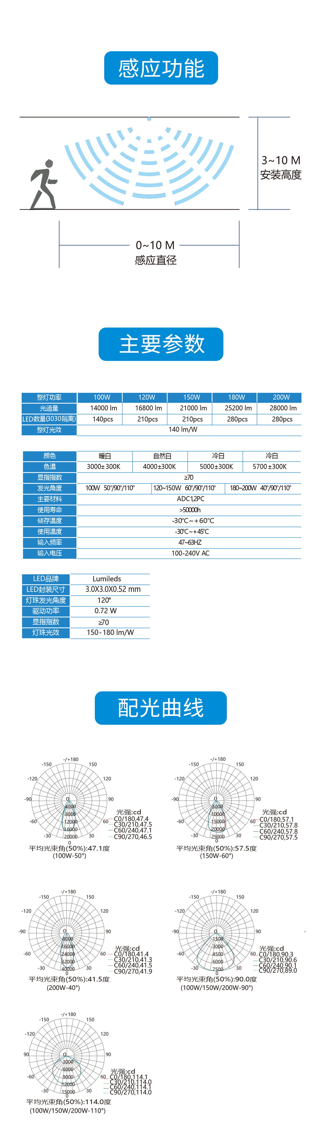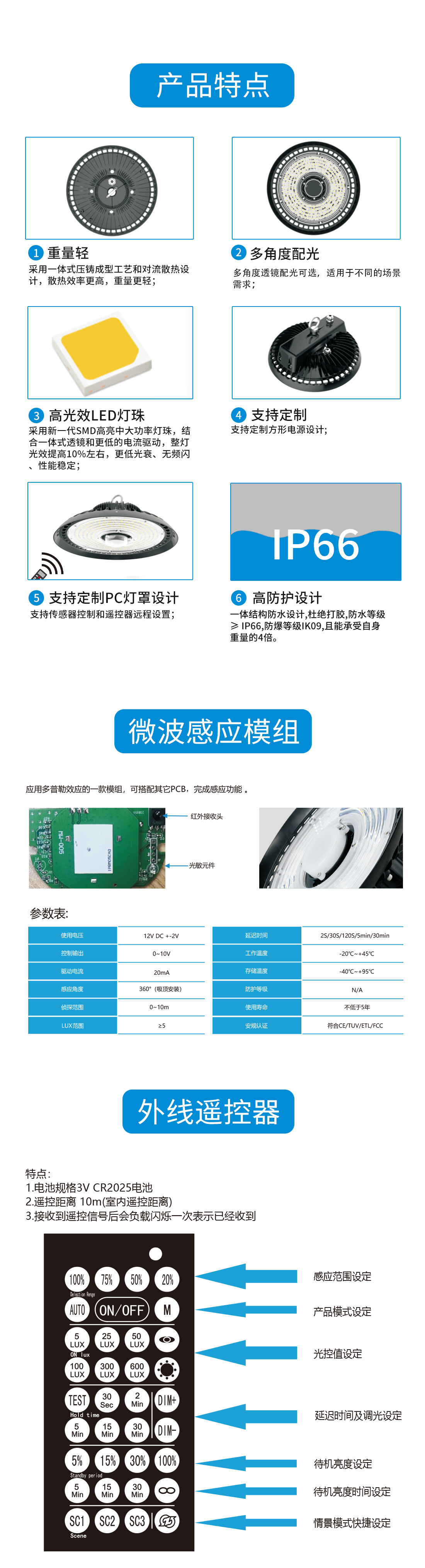 一体压铸成型,对流散热设计,新一代SMD高亮中大功率灯珠,多角度透镜配光可选,支持定制方形电源设计,支持传感器控制和遥控器远程设置,防水等级IP65。